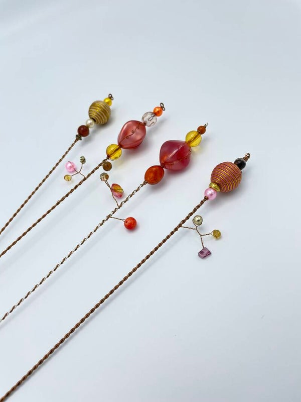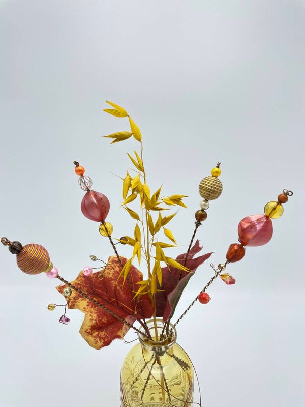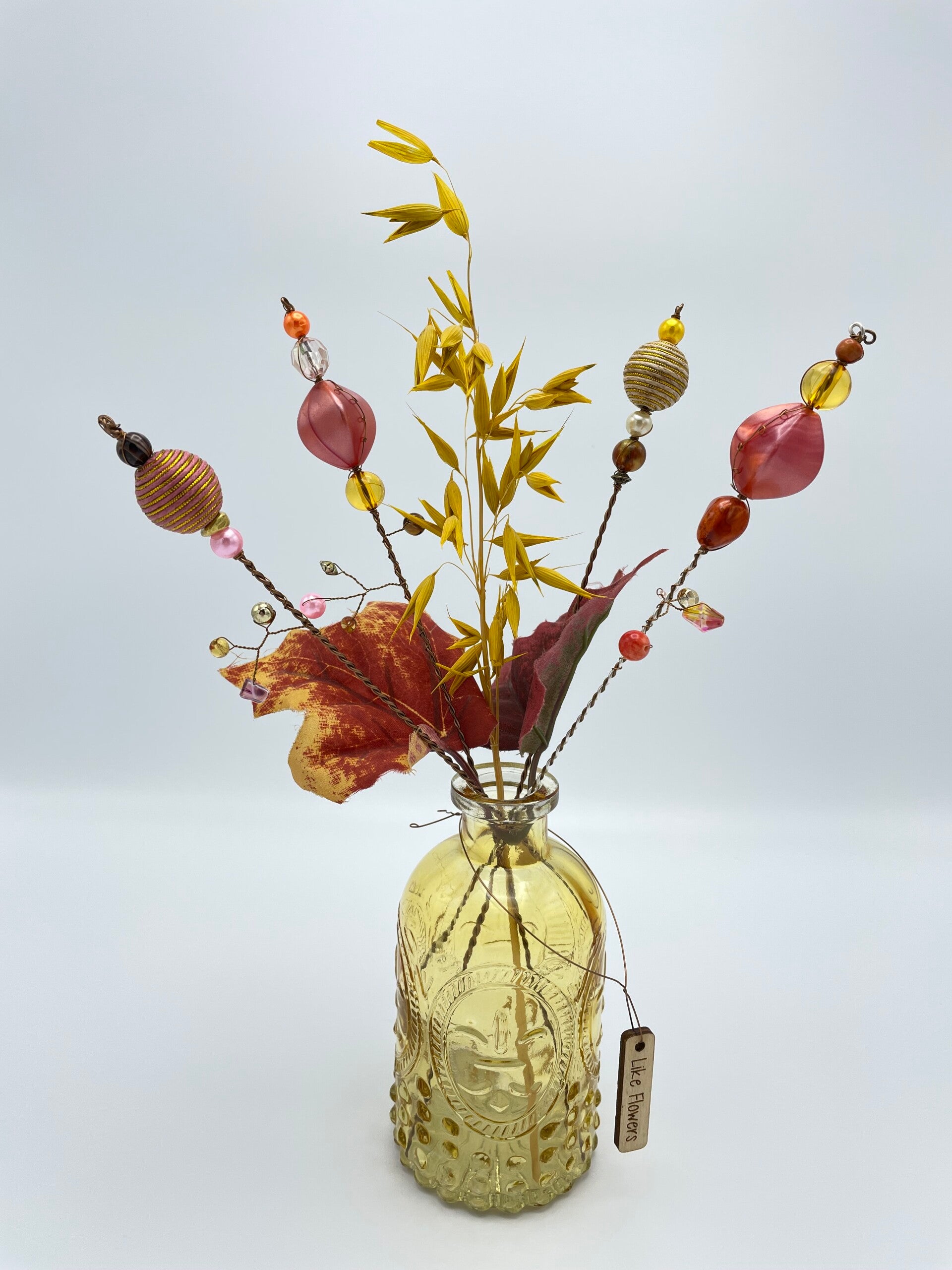 Boeketje van 4 kralen bloemen op antiek brons metaaldraadin geel vaasje met droogbloemen en herfstblaadjes