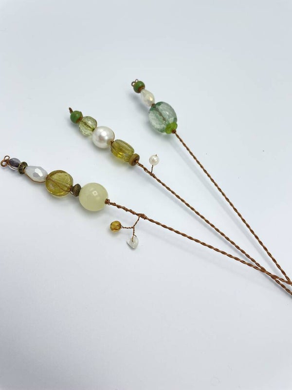 3 kralenbloemen op antiek brons metaaldraadin transparante neutrale kleuren
