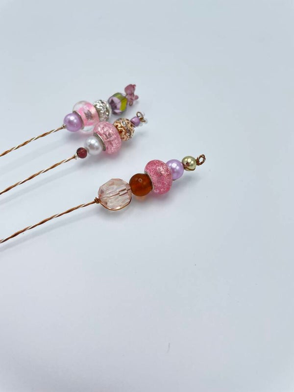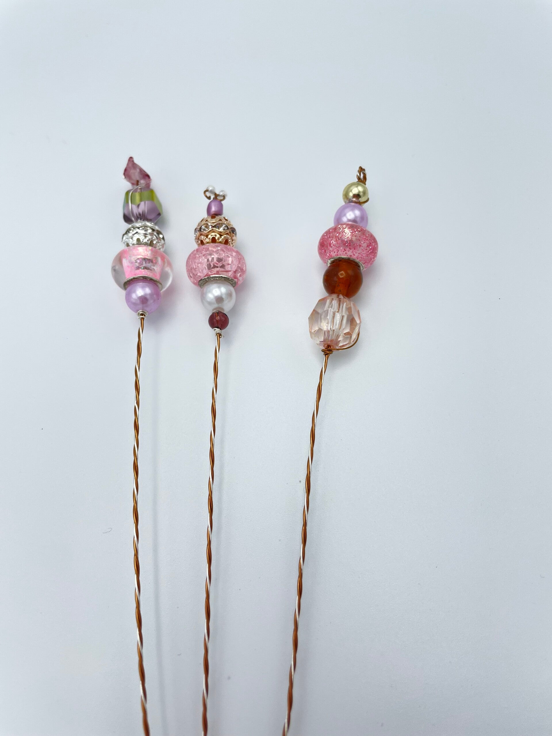 3 bloemtakjes met roze, lila en gouden kralen op een twist van verzilverd en antiek brons metaaldraad