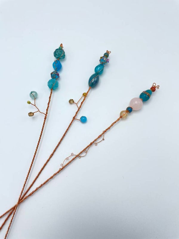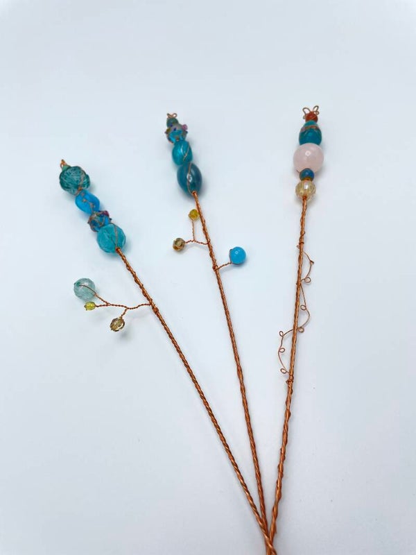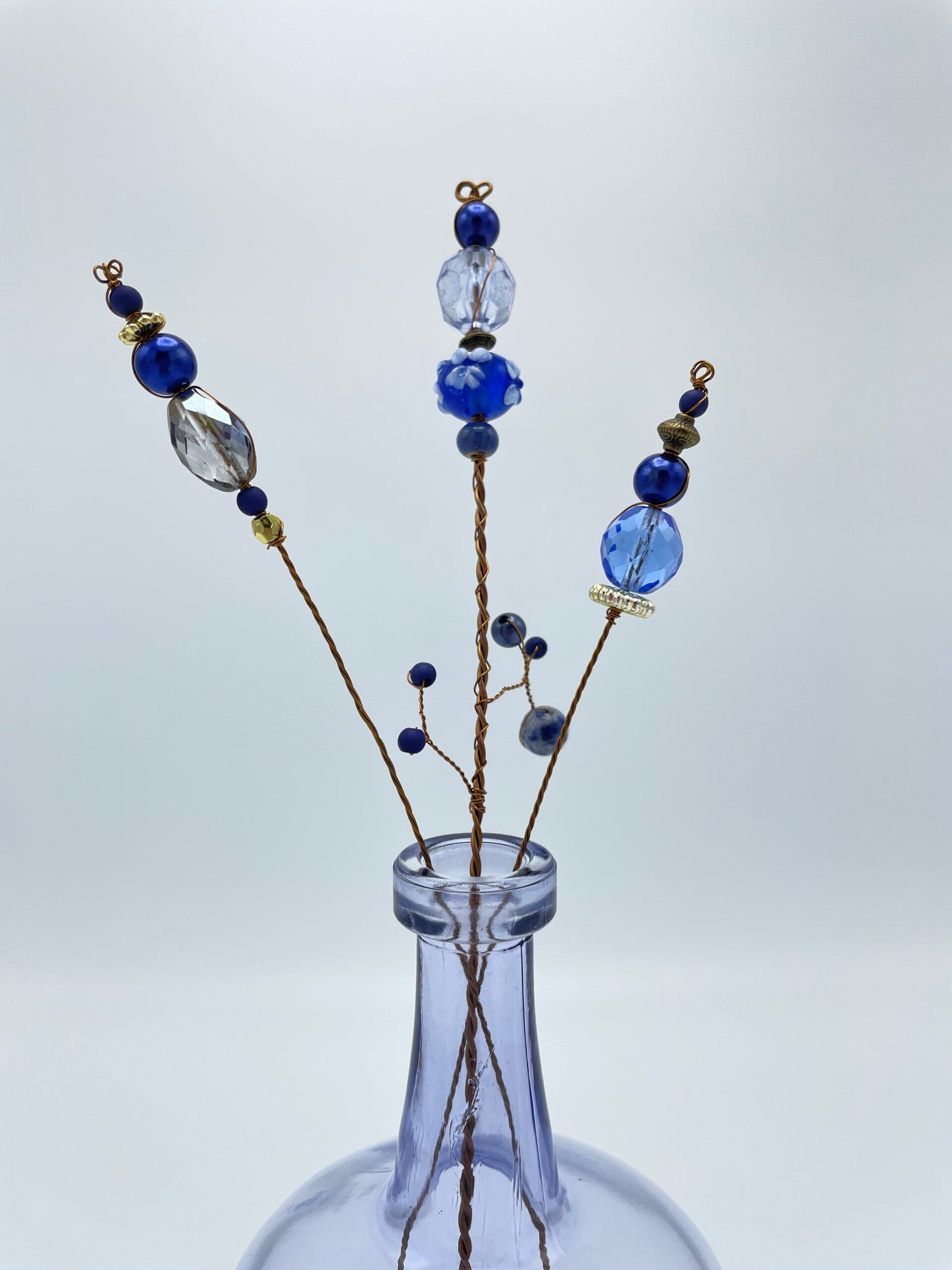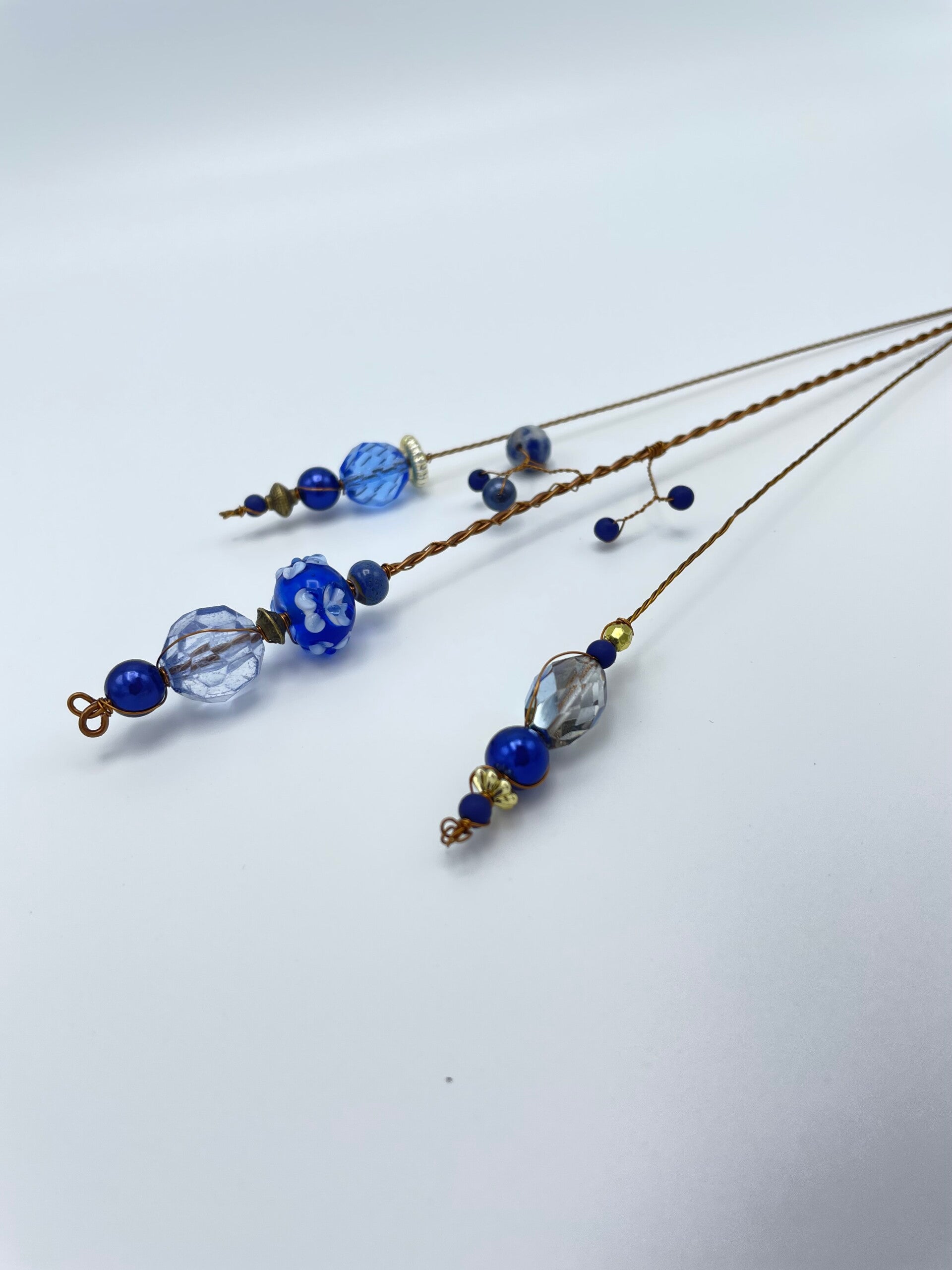 3 bloemtakjes met blauwe kralen op koper/brons kleurig metaaldraad
